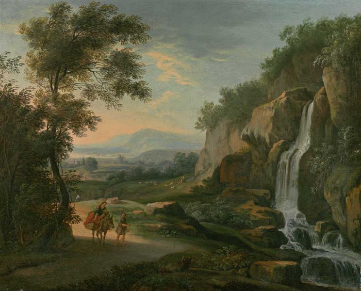 Arkadische Landschaft mit Katarakt und Figurenstaffage