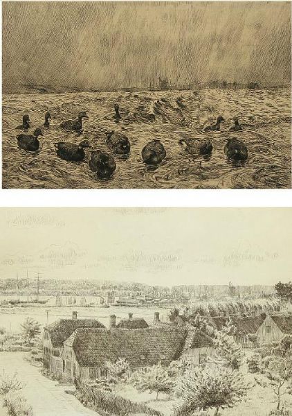 | Udsigt over Kerteminde og "En flok knortegæs. Regntykning". | |