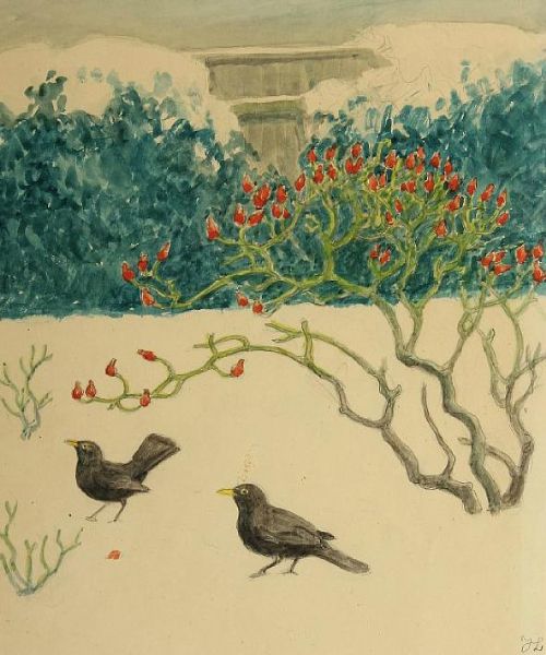 Wintry garden scenery with blackbirds