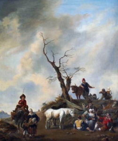 Ruhende Bauernfamilien mit Tieren am Wegrand