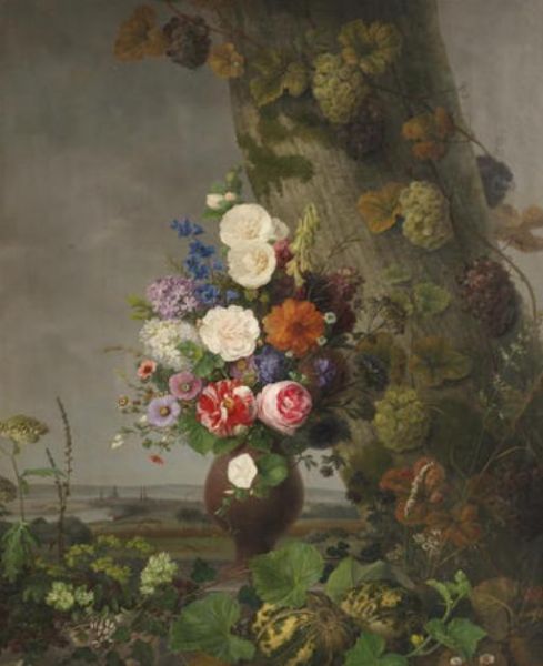 | A still life of flowers in a landscape, a town in the distance | |