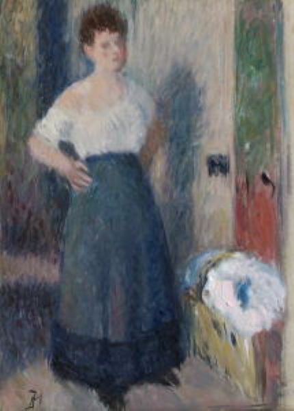 Stehende Frau in langem Rock mit von der Schulter gerutschter Bluse