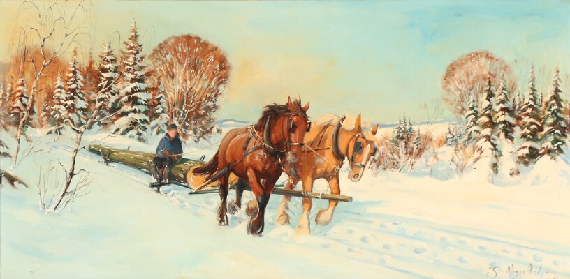 Horses dragging a treetrunk through a winter landscape