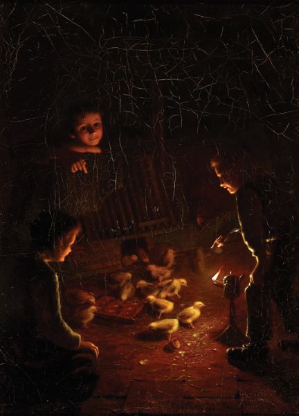 Looking at chicks by lamplight