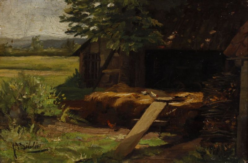 Een boerenerf met hoenders.