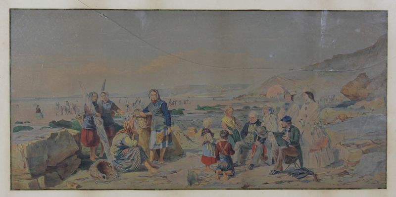 | an extensive Dorset beach scene with figures, fisherfolk and children with distant buildings and harbour | |