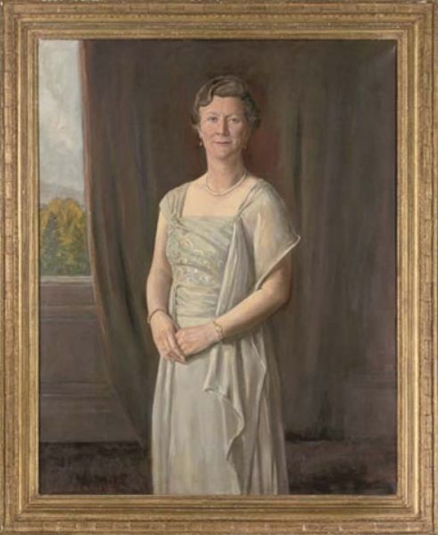 | Portrait of Mrs Harold Dutton Podmore, three-quarter-length, in a white dress, in an interior, a treescape beyond | |