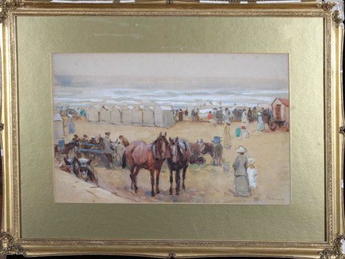 HORSES AND DONKEYS ON A BEACH WITH A BATHING MACHINE AND TENTS AT THE SHORE