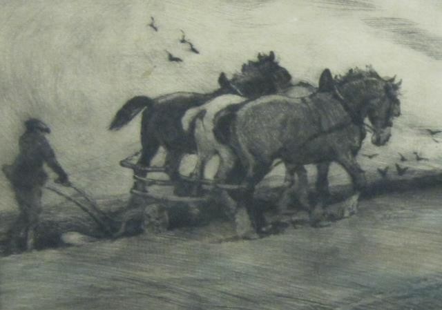 "October" - a plough team on the crest of a hill