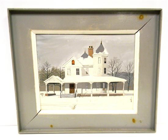 monotone depiction of white turreted Queen Anne Style house partially obscured by snow