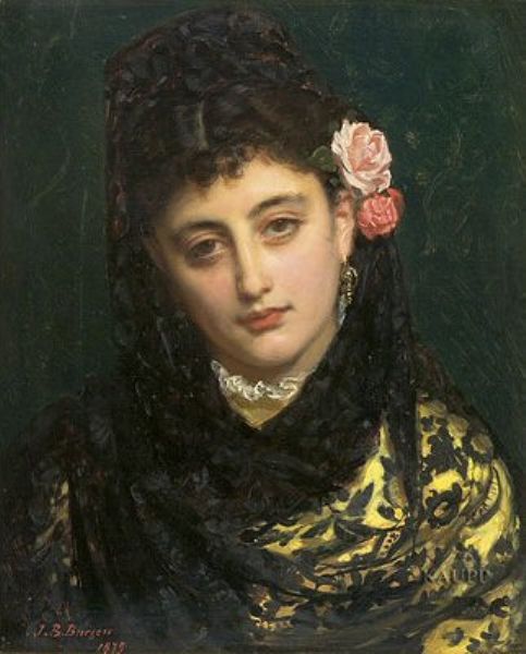 | Vor dunklem Fond Brustbildnis einer jungen Spanierin, einen mit Rosenblüten verzierten schwarzen Schleier um ihre Frisur tragend | |