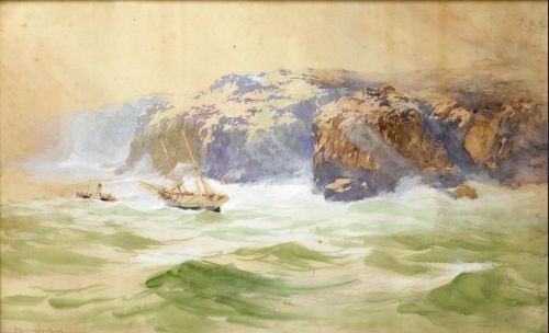 A stormy coastal scene with a paddle steamer and a sailing ship