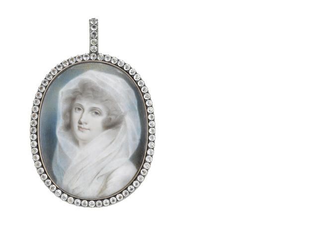 | An Actress, traditionally identified as Lady Emma Hamilton (1765-1815), wearing white dress, her hair powdered beneath a white v | |