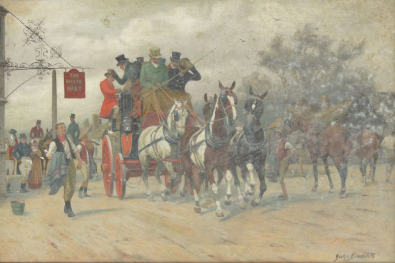 | A Coaching scene with coach and horses and figures outside the White Hart Inn | |