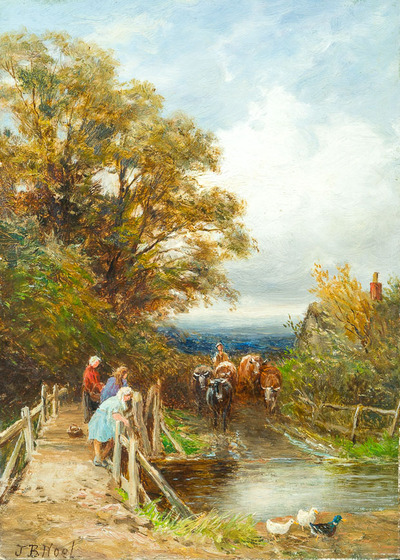 The ford. Shepherd, driving his cows to the water