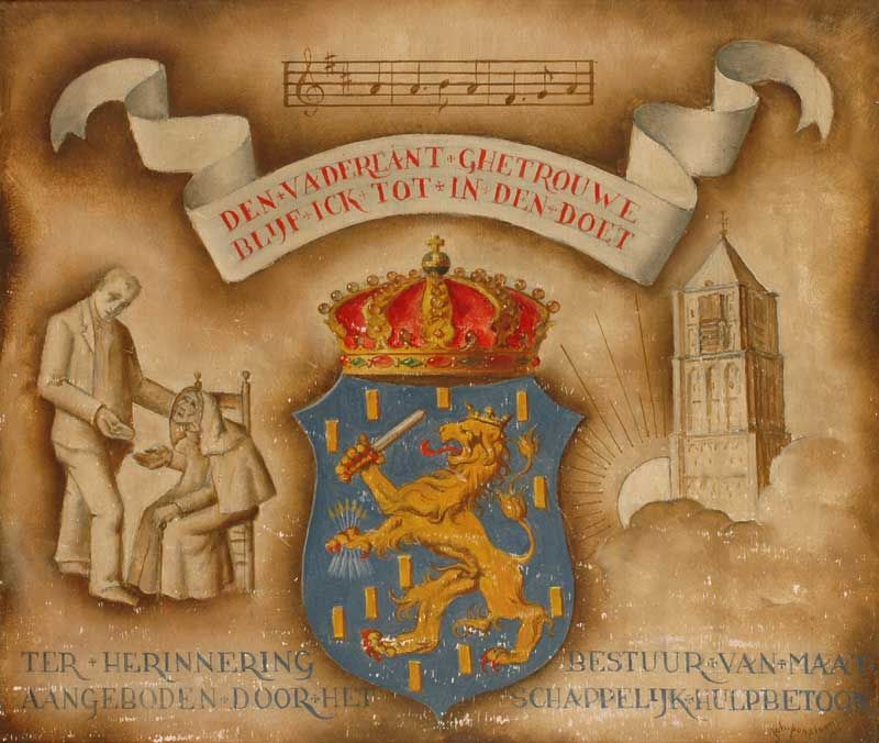 | Wapenschild en tekst: 'Den Vaderlant Ghetrouwe Blijf Ick Tot In Den Doet' | |
