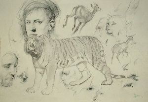 Sketchbook page with animal and portrait studies