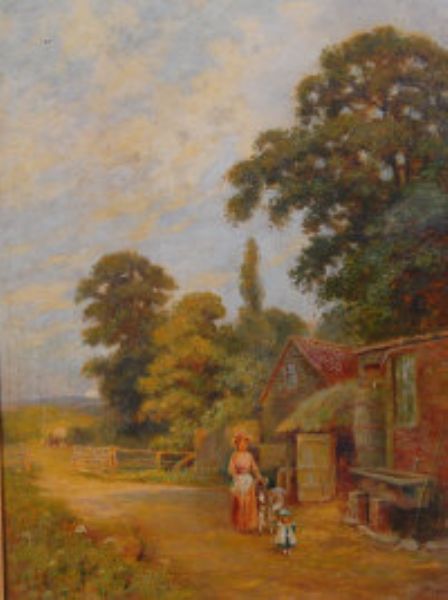 Suffolk landscape with figures, donkey and hay barn