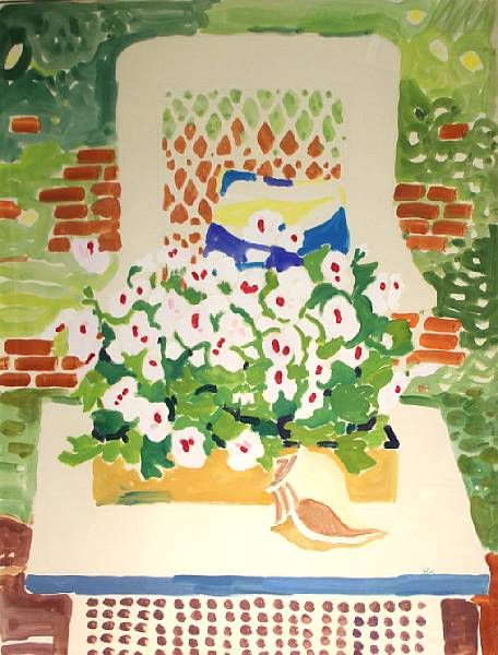 | Flowers and garden chair; Yellow lily with umbrella; Basket of flowers with blue lattice | |
