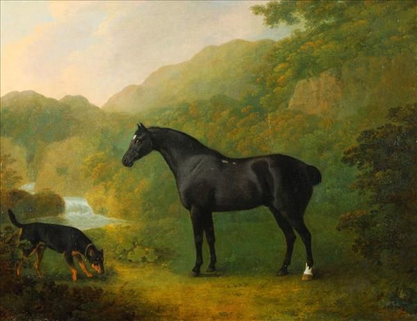 A bay horse and a dog in a landscape