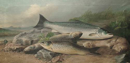 A salmon and a sea trout on a bank; A salmon and three brown trout on a bank