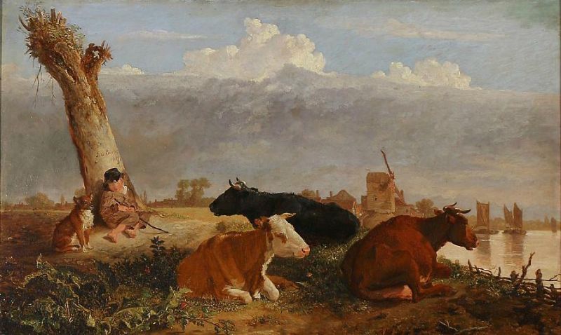 Resting cattle and a sleeping shepherd boy on a river bank