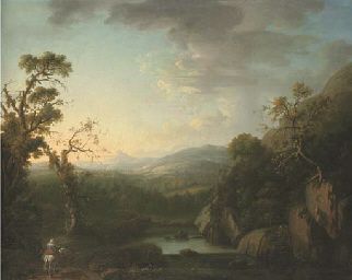 | An extensive river landscape with a figure and horse on a path in the foreground | |