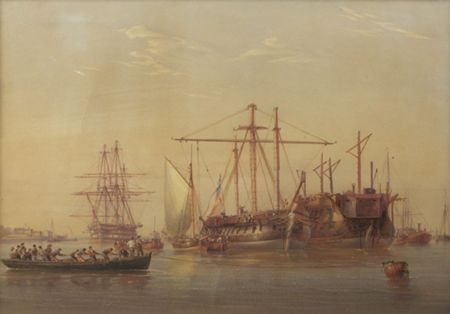 | A MAN OF WAR AND A PRISON HULK MOORED IN AN ESTUARY, FIGURES IN A ROWING BOAT IN THE FOREGROUND | |