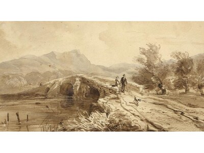 A COUPLE AND THEIR DOG ON A PACKHORSE BRIDGE