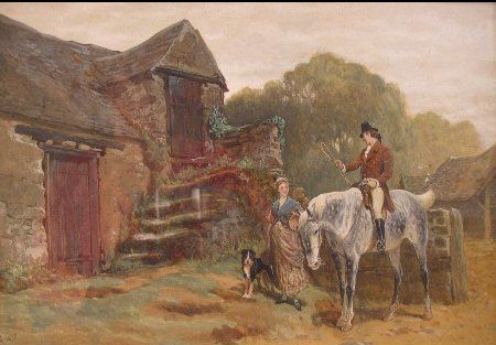 | Figures outside a barn, gentleman seated on a horse, female with a dog | |