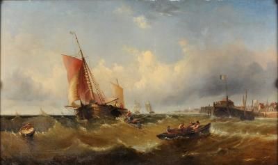 | Fishermen and shipping at the entrance to a Dutch harbour | |