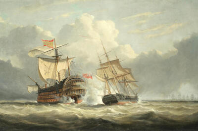 Captain Richard Bowen's 38-gun frigate Terpsichore engaging the mighty 136-gun Spanish 4-decker Santissima Trinidad on 1st March 1797, two weeks after the battle of Cape St. Vincent ~ | |