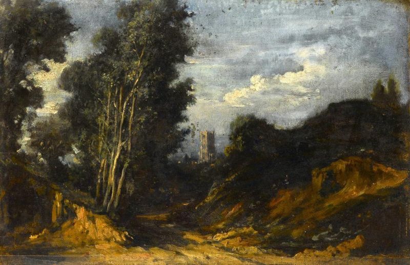 | LANDSCAPE WITH FIGURES ON A SANDY LANE A CHURCH BEYOND | |