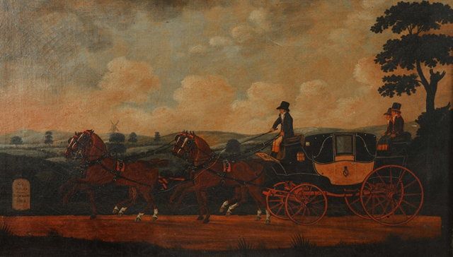 A coach and four about to pass a milestone inscribed '49 Miles from London