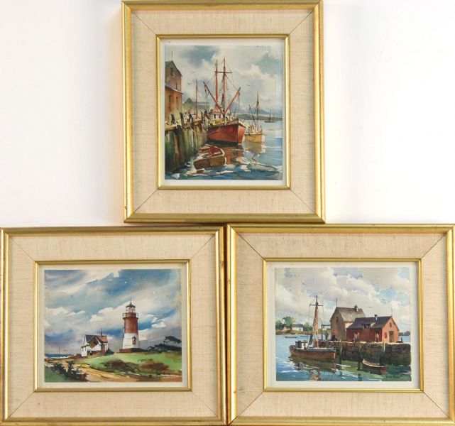 Two of fishing boats at docks, and one of a lighthouse, possibly Nobska Light