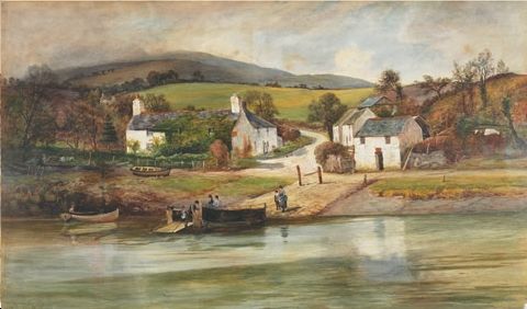 FIGURES BOARDING A FERRY ON A VILLAGE SHORE