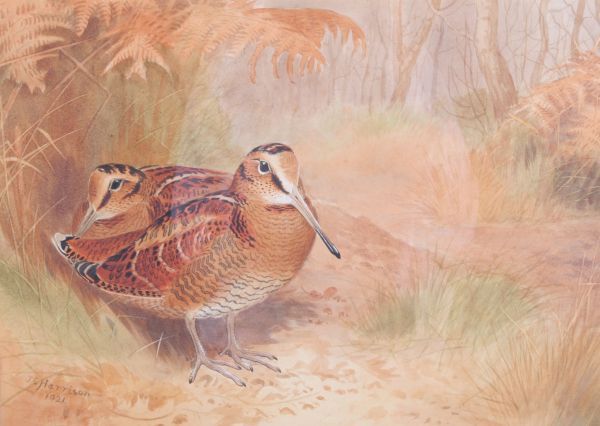 A pair of woodcock sheltering left; A pair of woodcock sheltering