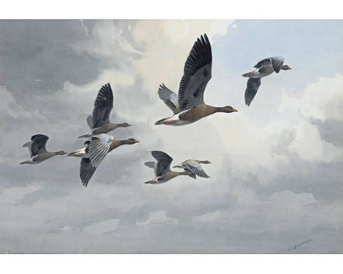 Greylags rising from the marsh