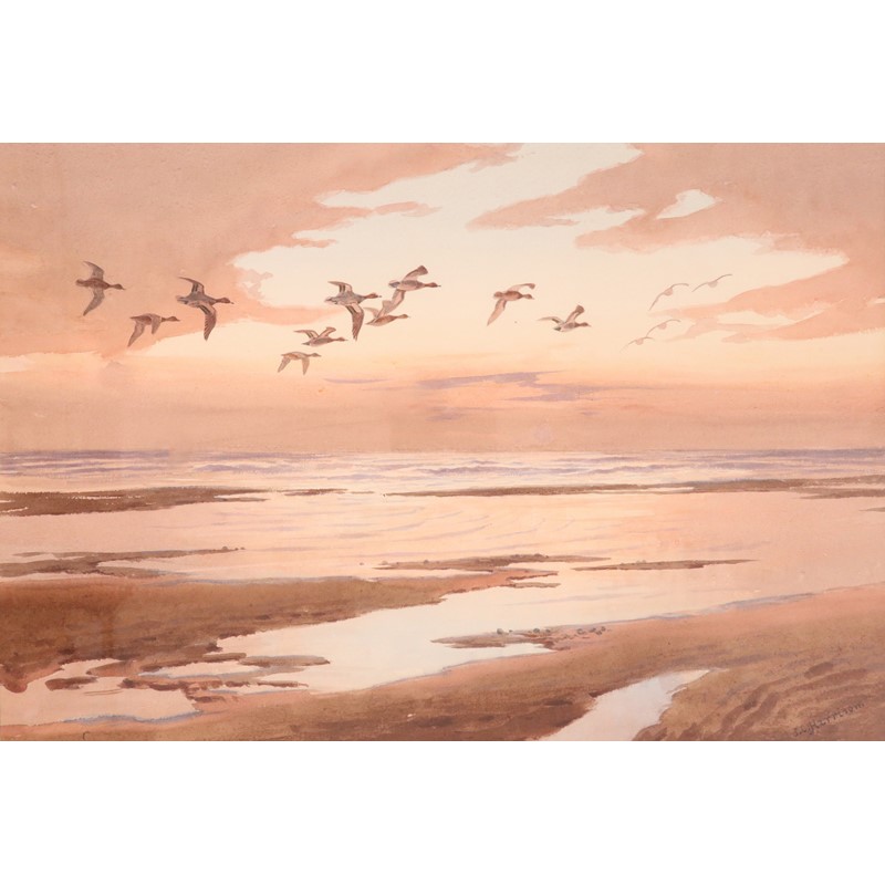 Widgeon over the coast at sunset