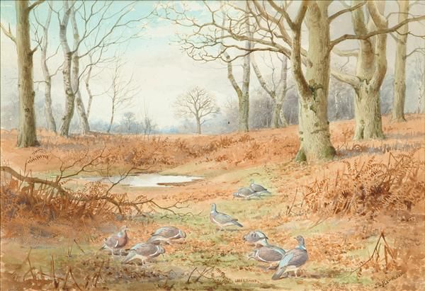 Wood pigeons feeding on acorns