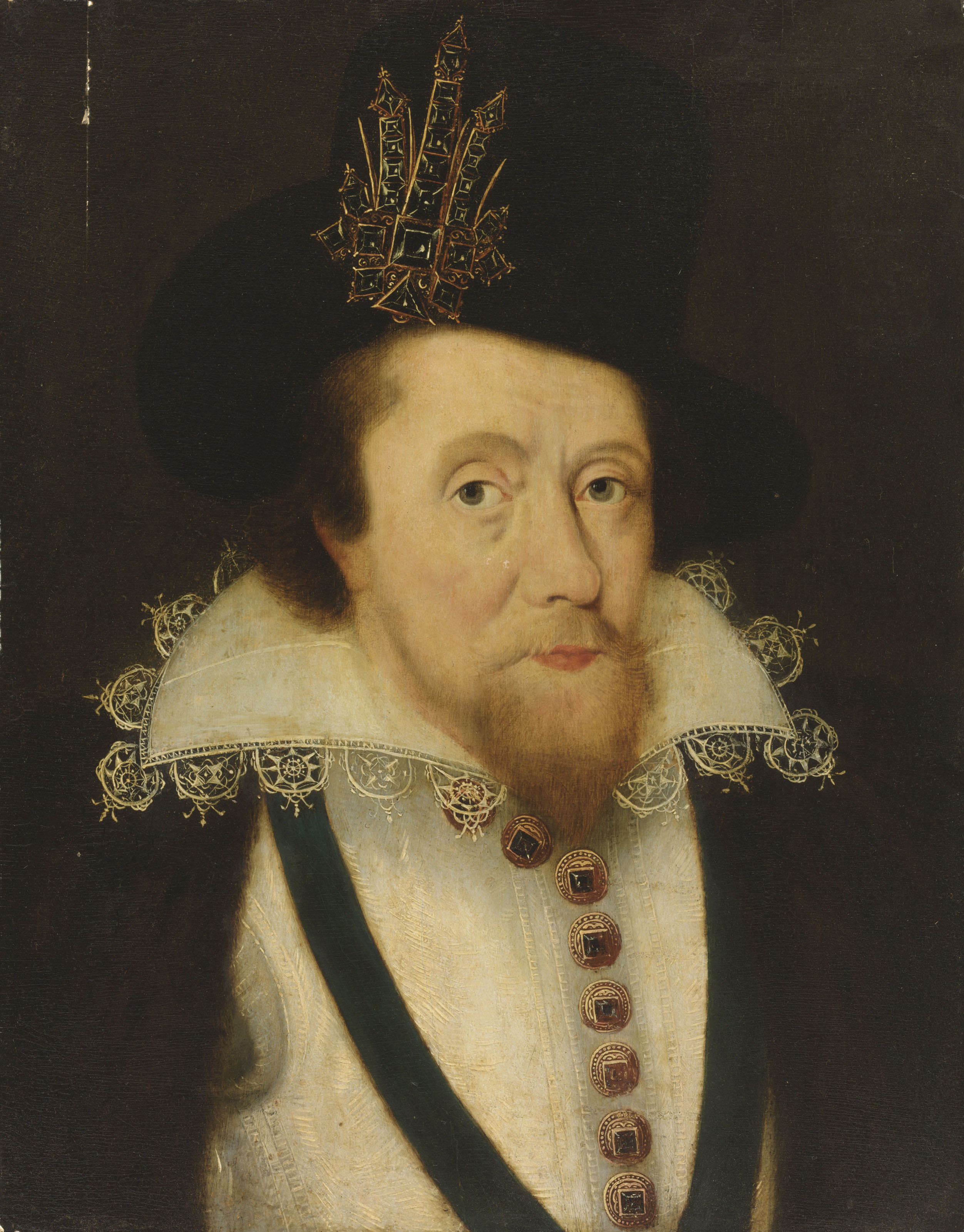 | Portrait of King James VI and I (1566-1625), bust-length, in a white doublet and black hat | |