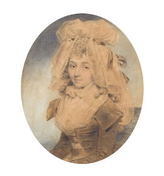 | Mary Montagu, later Lady Templetown (d.1824), seated, wearing grey jacket over striped dress, white fichu and gathered veil held | |