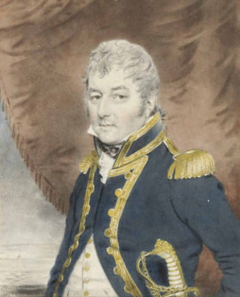 | Portrait of a Naval Officer, half length, wearing uniform and standing beside a red draped curtain | |