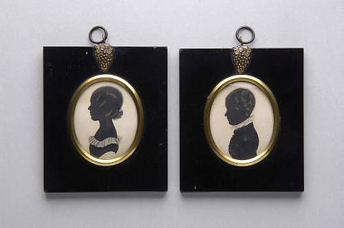 A silhouette portrait of a young girl, her hair in ringlets and wearing a lace frilled gown