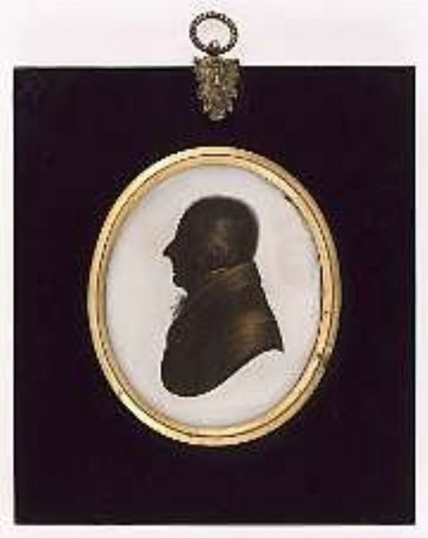 A silhouette of John Evans (1763-1834), profile to the left, wearing coat and cravat