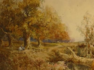 Woodland Scene with Sheep, dog and Figure on a Horse