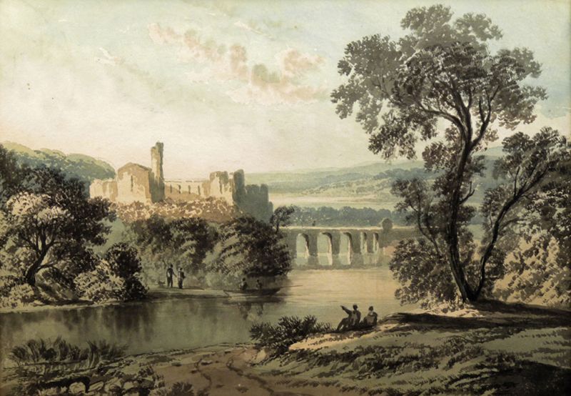 CLASSICAL RIVER LANDSCAPE WITH FIGURES AND CASTLE RUINS