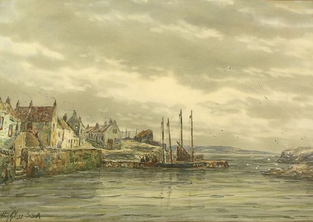 A quiet harbour with stone houses on the quayside, gull and moored fishing vessels