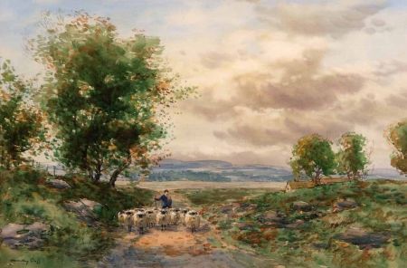 Shepherd and Sheep in a Country Path, Cottages and Mountains Beyond