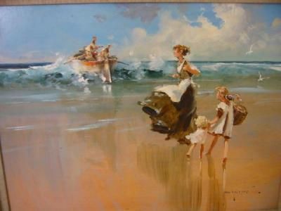 Beach Scene with Mother and Children, a boat coming ashore beyond